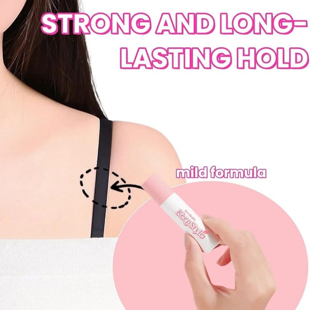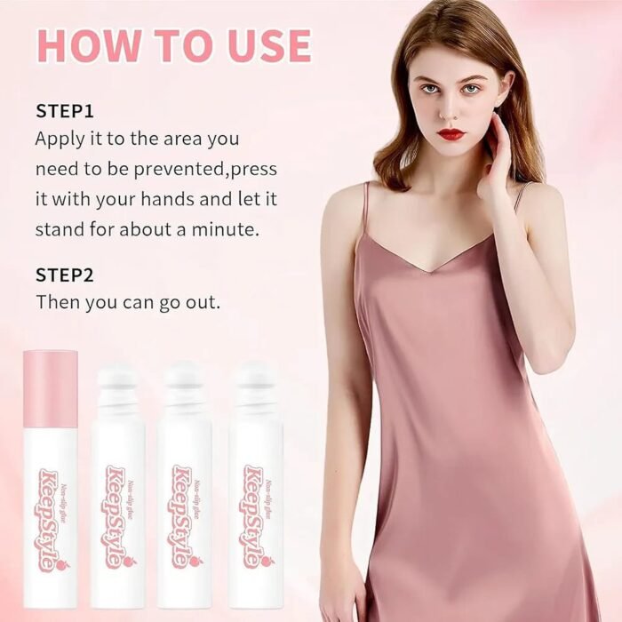 - Roll the glue on clean skin where you want your clothes to stay in place.